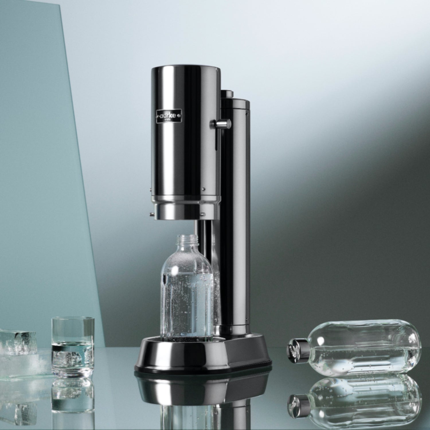 A sparkling water maker in a contemporary design, with a smooth one-handed operation. It’s made of stainless steel and comes with a dishwasher safe glass bottle.